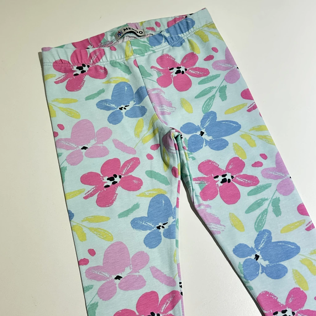 Calza Lupe: la elección ideal para la media estación y los días de verano. Esta calza estampada presenta un diseño delicado con flores en colores rosa y celestes sobre un fondo celeste claro, aportando un toque femenino y fresco a cualquier outfit.